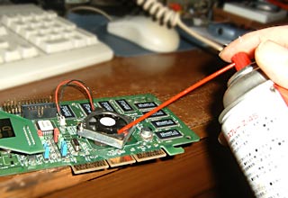 そこで登場するのが、よくあるところの「浸透防錆潤滑スプレー」である。ホントはファンの軸に一滴だけ落とせばいいのだけど、ファン自体をバラさないと軸が見えない。しかたないので、強攻策に出てみた。ファンに対してブシュッ・・と吹きかけたのである。(マネしてファンが回らなくなっても or カードが動作しなくなっても 責任は負えません。判断は慎重に)